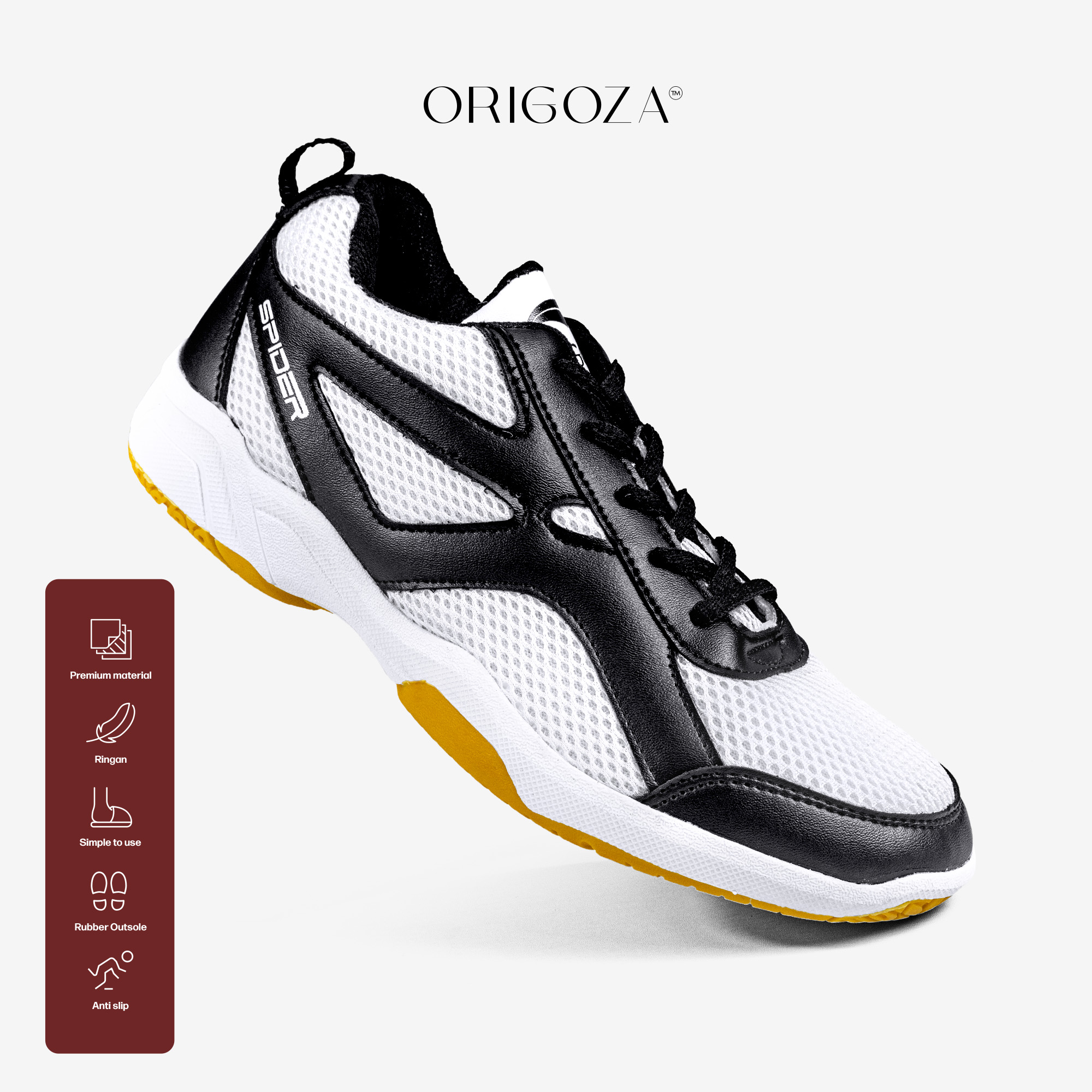 - Upper kulit sintetis tebal dan kuat serta menggunakan material Sandwich Mesh, Microfiber